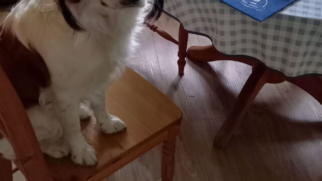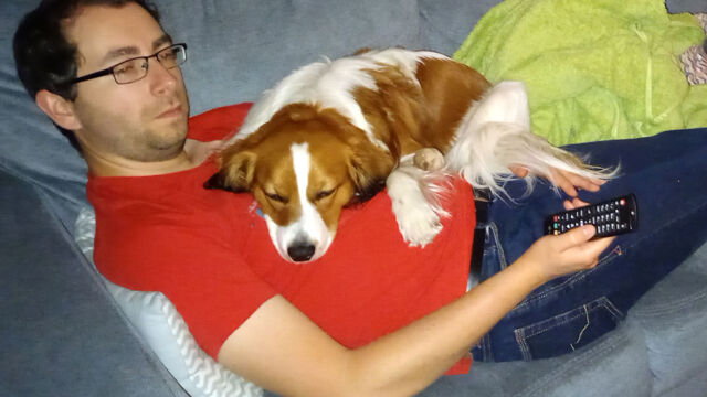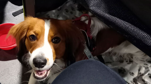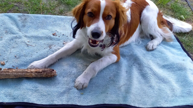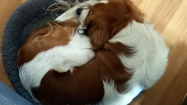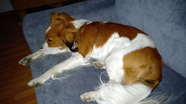 Wieder zu Hause und auf seinen Schlafplatz buchsiert, sitzt er mit aufmerksam aufgestellten Ohren da und reißt immer wieder die Augen auf. Die Augen wollen ihm schon im Sitzen zufallen, aber er reißt sie immer wieder auf, um bloß nichts zu verpassen. Die Hündin könnte ja am Grundstück vorbeilaufen!