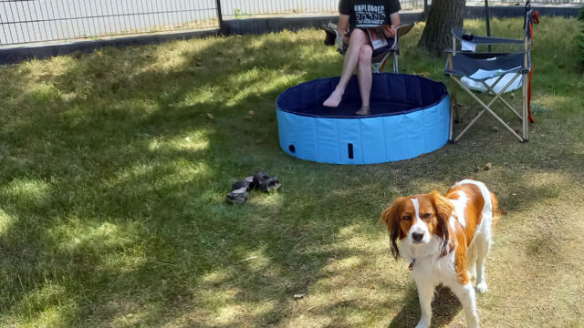 Dass er so allmählich erwachsen wird, merkte man auch daran, dass er inzwischen an Ausstellungen teilnimmt. Er hat Ende Juni in Chemnitz in der Jugendklasse den ersten Platz belegt. Zwar nur mit der zweitbesten Note „sehr gut“, aber mit der Begründung: er ist einen cm zu groß, sonst wäre es die Bestnote geworden. Unser Ziel ist die Zuchtzulassung. Dafür reicht uns zum Glück auch ein „sehr gut“, es muss kein „vorzüglich“ sein.