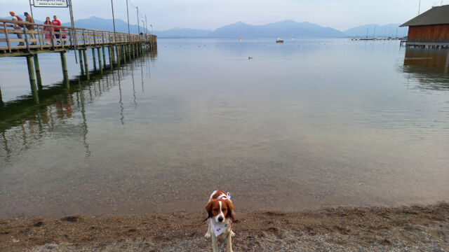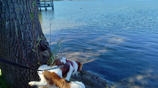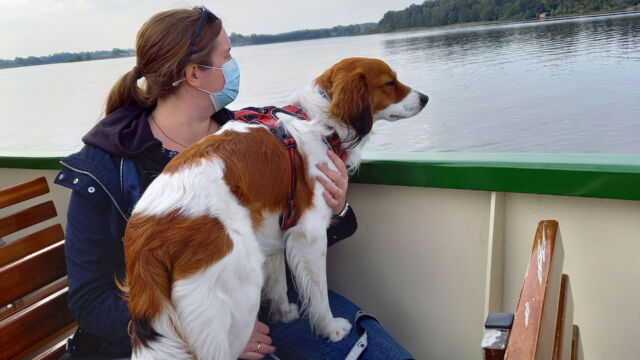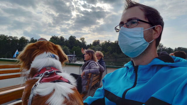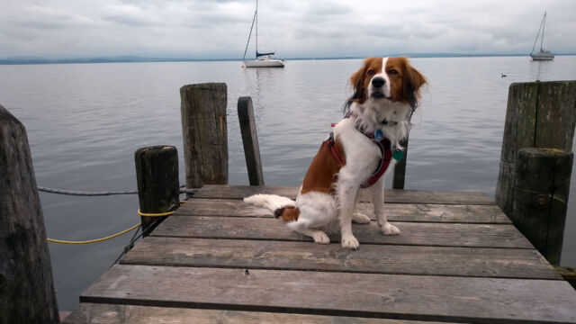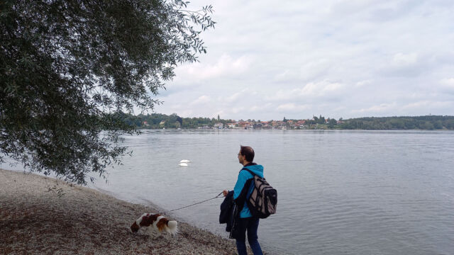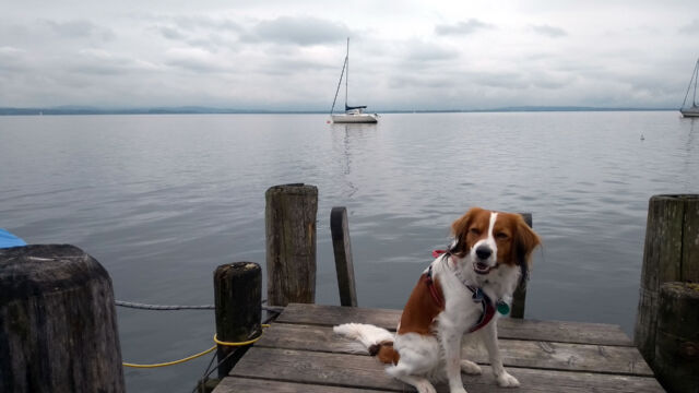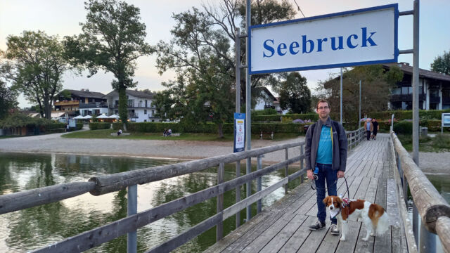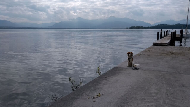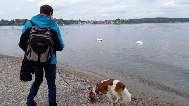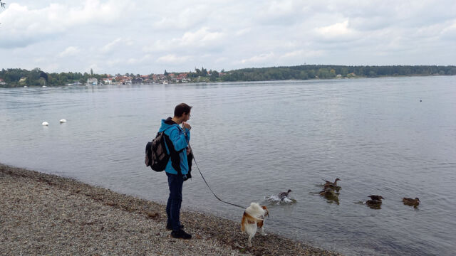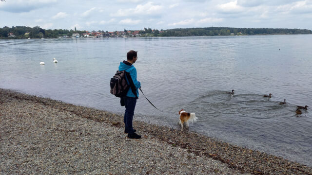 Wenn man schon am Chiemsee ist, muss man natürlich die Herreninsel und die Fraueninsel erkunden. Da kommt man am entspanntesten mit der Fähre hin. Hunde sind erlaubt. Und Sherlock musste auch keine Maske oder Maulkorb tragen. Die vielen fremden Menschen waren ihm herzlich egal und er konnte die Überfahrten in Ruhe genießen. Und wir auch. Auf der Fraueninsel kam es sogar zu einer sehr lustigen Situation, als ein Schwarm Enten tatsächlich hinter Martin und Sherlock her schwamm. Da hat der Entenlockhund seinem Namen alle Ehre gemacht.