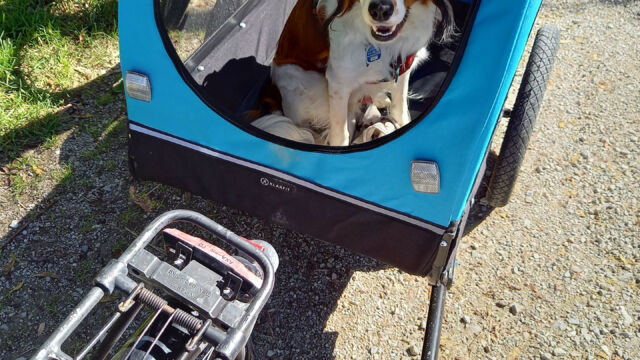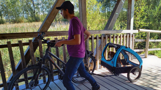 Aber selbst Hunde neben seinem Anhänger haben ihn nicht dazu veranlasst unruhig zu werden oder heraus zu wollen. Die größte Mühe hatte Martin, der den Anhänger den kompletten Tag ziehen durfte.
