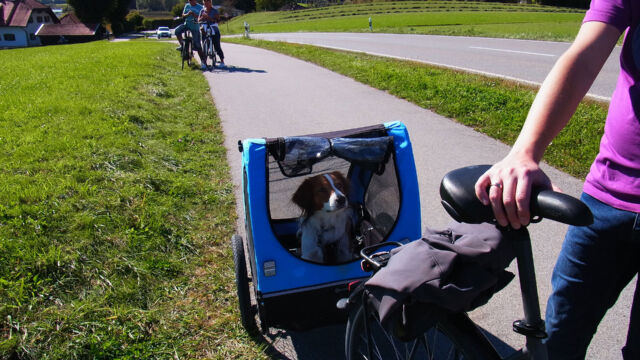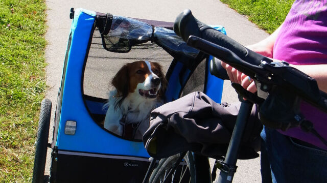 Auch ein absolutes Muss bei diesem im Grunde Hochsommerwetter ist eine Radtour rund um den Chiemsee. Da wir es bisher versäumt haben Sherlock das saubere Laufen am Fahrrad beizubringen, haben wir uns zu den zwei Rädern auch einen Hundeanhänger geliehen. Und es waren keine e-Bikes! Nur gute Muskelkraft! Der Chiemseeradweg ist zum Glück auch größtenteils flach. Sherlock hat die Aussicht aus seinem Anhänger sichtlich genossen. Er hat oft die Nase herausgestreckt und nach links und rechts geguckt. Keine Sorge, er hätte nicht rausspringen können, da er mit einem Gurt am Geschirr angeschnallt war.