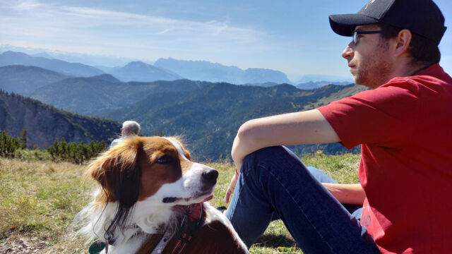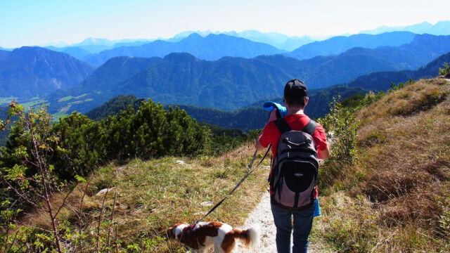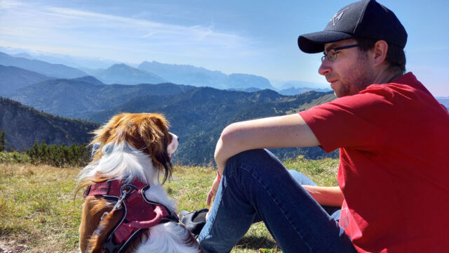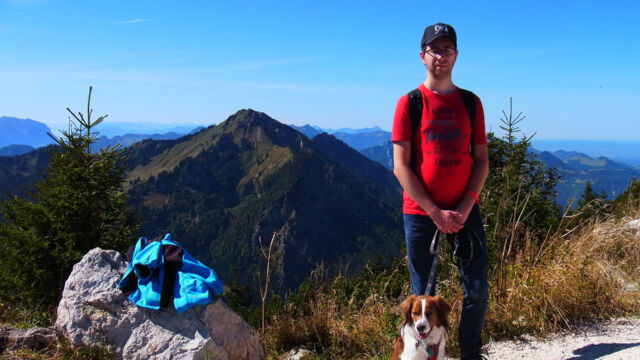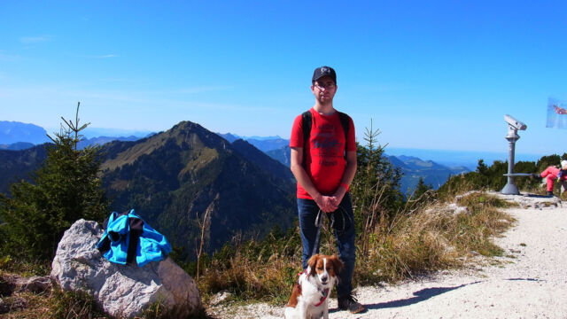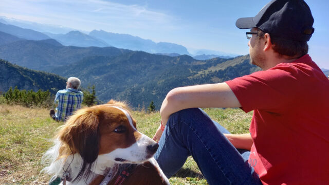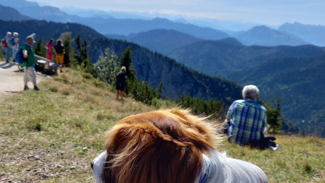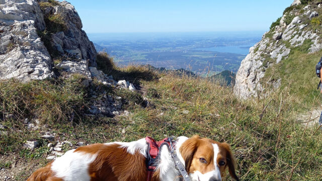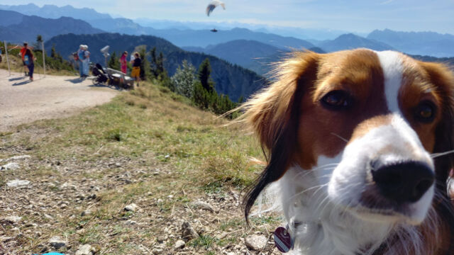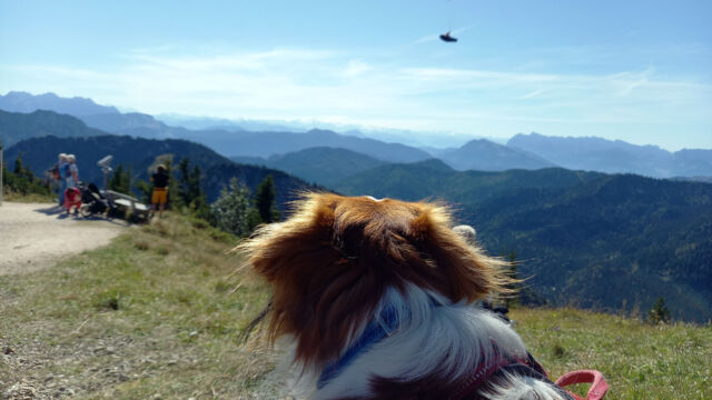Wenn man schon als Kind der norddeutschen Tiefebene im Chiemgau ist, dann muss man natürlich auch mal auf einen Berg. Und da ich aber nicht die geborene Bergsteigerin bin, haben wir abgekürzt und sind mit der Seilbahn zunächst auf den Gipfel des Hochfelln. Dort haben wir bei strahlendem Sonnenschein den Gipfel umrundet und auf einer Rasenfläche pausiert. Sherlock war hingerissen von den Gleitschirmfliegern. So große Vögel hatte er bisher nicht gesehen. Und so dicht über unseren Köpfen! Kamen sie zu nahe, musste er sie kurz anbellen. Aber vor allem hat er sie nicht aus den Augen gelassen. Das steinige Terrain war für ihn kein Problem. Galant wie eine Bergziege ging er die zum Teil schmalen Wege vor uns an der Schleppleine entlang.