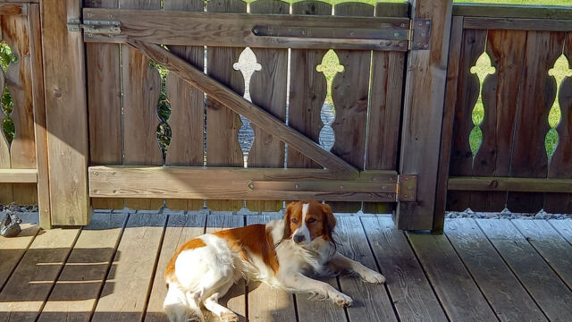 Auch zu dem Areal gehörte ein eigener umzäunter Bereich am Wasser. Nachdem wir Sherlock mehrere Wochen schonen mussten, da er sich beim Toben mit einem sehr viel schwereren Hund am Rücken verletzt hatte, war nun endlich die Zeit gekommen, dass er wieder nach eigenem Ermessen rennen durfte. Wir leinten ihn also in dem menschenleeren Gebiet ab und „Feuer frei!“. Es war so herrlich mit anzusehen, wie er Gas gab. Er rannte und schlug Haken, als wäre nie etwas gewesen. Er erkundete in einem Affenzahn den kleinen Strand, das Gebüsch ringsherum und rannte im Übermut sogar ins Wasser. Er rannte den geworfenen Stöckchen hinterher und konnte einfach endlich wieder Hund sein. So startete der Urlaub für alle mit einem guten Gefühl.
