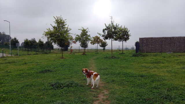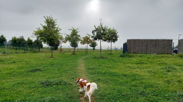 Auf der langen Heimfahrt vom Chiemsee nach Brandenburg ist uns dann zufällig eine richtig schöne Raststätte begegnet. Sie hatte einen eingezäunten Hundeauslauf, der auch extra als Hundewiese gekennzeichnet war! Super! Gras, Bäume, Kotbeutel und Mülleimer. Groß genug um anderen Hunden aus dem Weg gehen zu können, klein genug, um den Hund jederzeit im Blick zu haben.